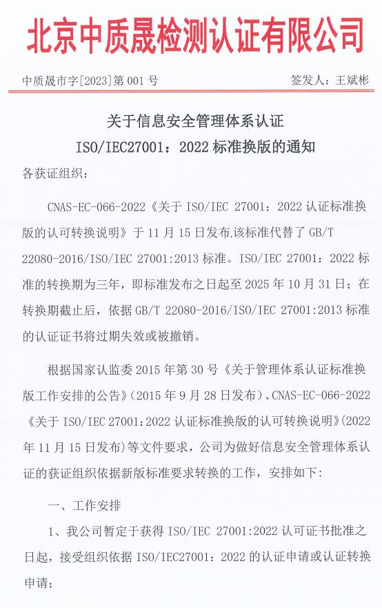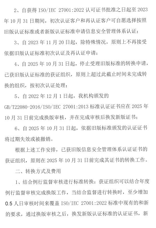 關(guān)于信息安全管理體系認(rèn)證ISO/IEC27001:2022標(biāo)準(zhǔn)換版的通知